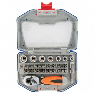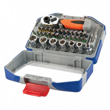 - Juego de vasos y mini carraca de 1/4" de 60 dientes TIVOLY de 34 piezas en estuche plástico.