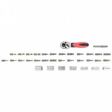 - Composición: mini carraca de 1/4", 7 puntas planas, 4 puntas pozidriv, 4 puntas PH, 4 puntas TORX, 4 puntas hexagonales, 7 vasos hexagona, 4 pozi, 4 phillips, 7 torx, 4 hexagonales, 7 vasos, adaptador 1/4 para vasos y llave de carraca 1/4.
